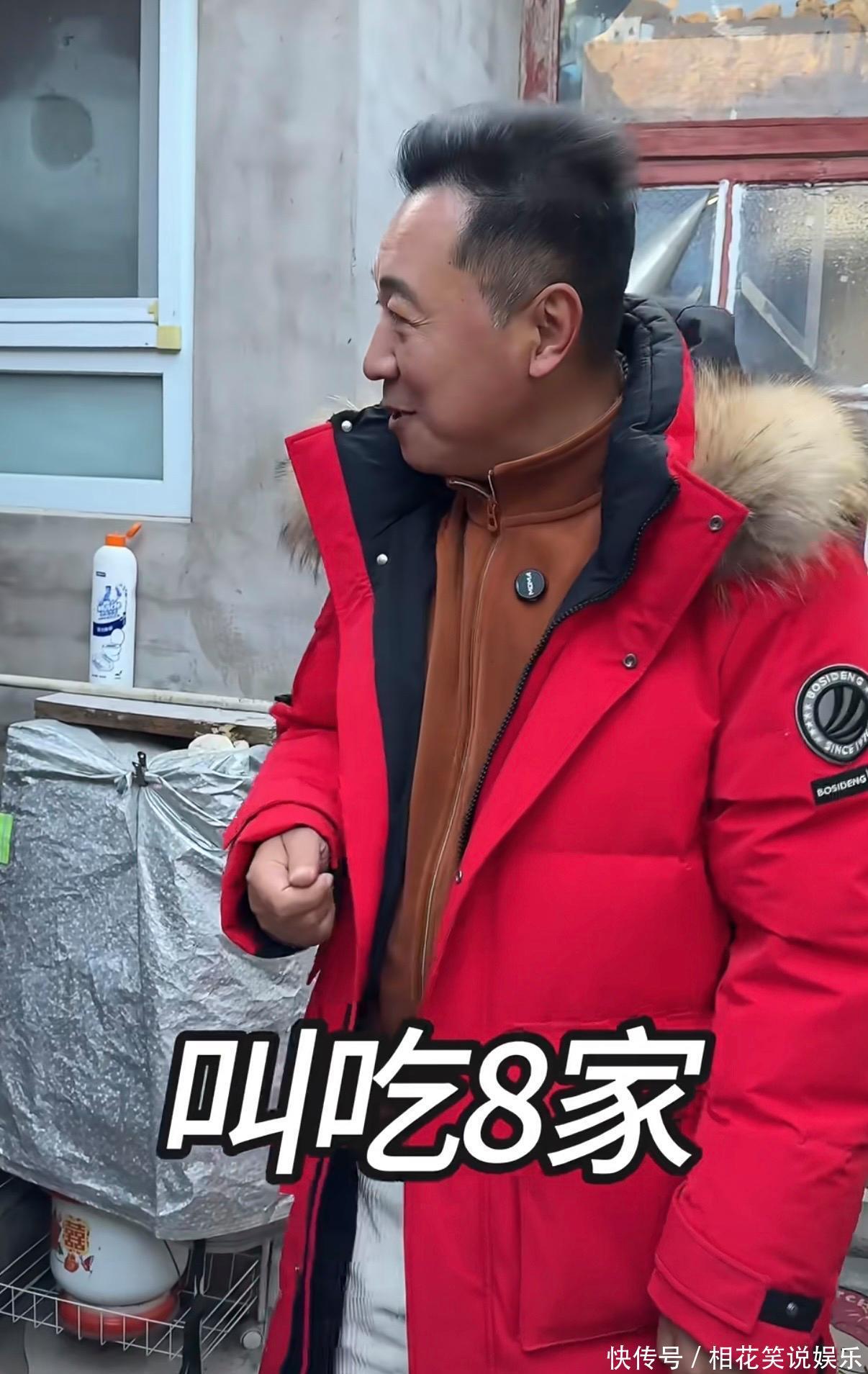 镜头里他穿件红色长款羽绒服,老远一看就特扎眼。